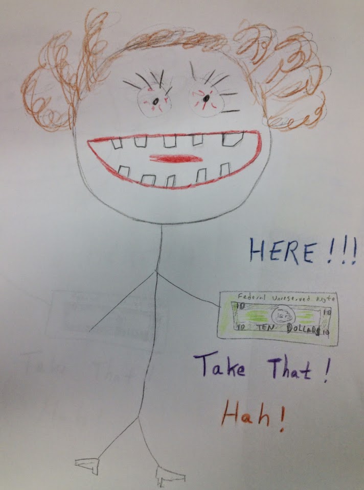 “HERE!!!” she bellowed at Rita, throwing a $10 bill at her. “The cashier said that was how much your meal was. That should cover it.” She turned around and walked back to her table.