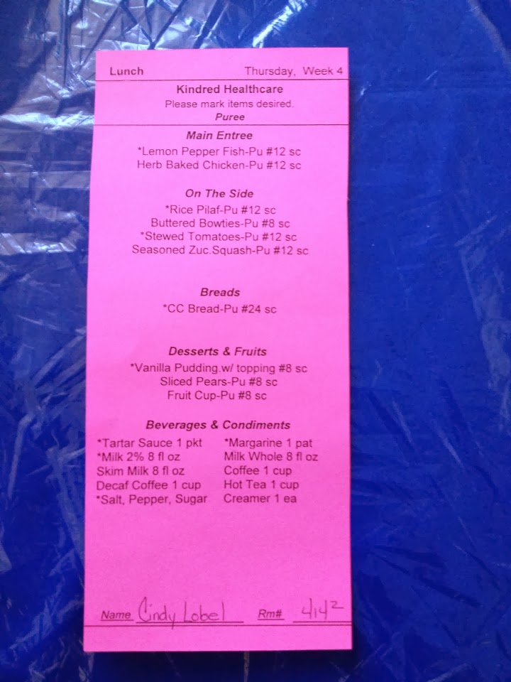 Cindy used a walker to help her keep her balance as she sat in the chair today for 1 1/2 hours.  She had lunch while she was sitting there.  You can check out the menu and lunch below.  Things didn’t look so appetizing.  The bread (bottom right) wasn’t great, she doesn’t like rice (top left) or anything green (zucchini in this case), but she liked the bow ties and butter (bowl in the middle).  It tasted like it was made with chicken broth.