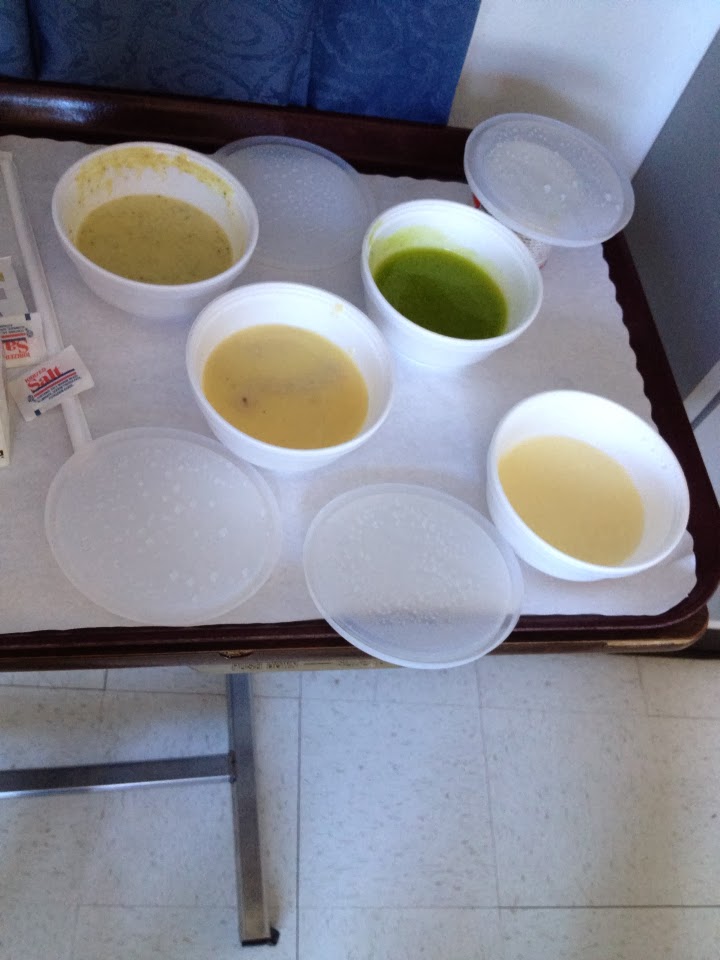 Cindy got to eat solid food today.  Well, it was puréed which is more solid than anything she’s had since November first.  She ate the fruit and ice cream but wouldn’t touch anything else.  To tell you the truth, it didn’t look very appetizing and Cindy is a very picky eater.  The lids on the main course in the picture below are closed to protect the innocent.