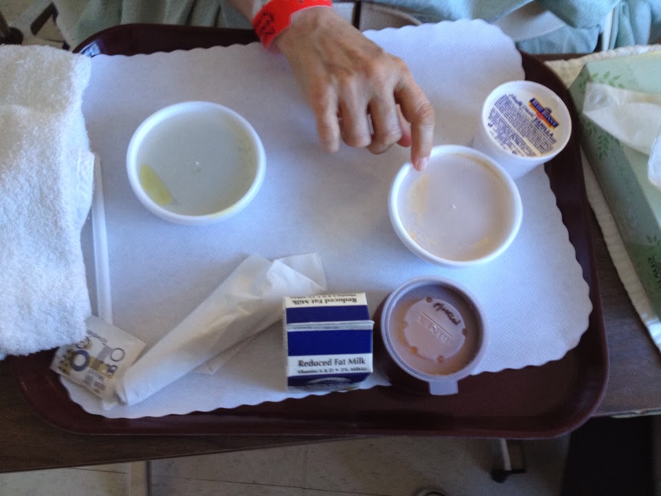 Cindy used a walker to help her keep her balance as she sat in the chair today for 1 1/2 hours.  She had lunch while she was sitting there.  You can check out the menu and lunch below.  Things didn’t look so appetizing.  The bread (bottom right) wasn’t great, she doesn’t like rice (top left) or anything green (zucchini in this case), but she liked the bow ties and butter (bowl in the middle).  It tasted like it was made with chicken broth.