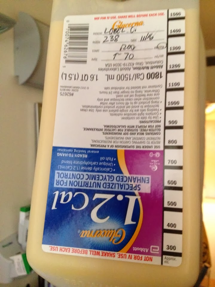 The nasaal feeding tube is working well. The TPN feeding was stopped yesterday. Her digestive system is working well. The picture below is what Cindy has for breakfast, lunch and dinner. Sometimes she has a midnight snack from this container, too. The picture is not upside down. This is the way it hangs. It is attached to the nasal tube.