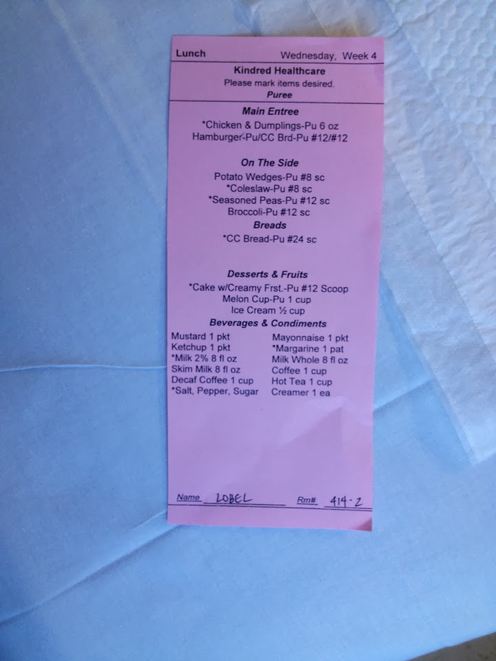 Cindy got to eat solid food today. Well, it was puréed which is more solid than anything she’s had since November first. She ate the fruit and ice cream but wouldn’t touch anything else. To tell you the truth, it didn’t look very appetizing and Cindy is a very picky eater. The lids on the main course in the picture below are closed to protect the innocent.